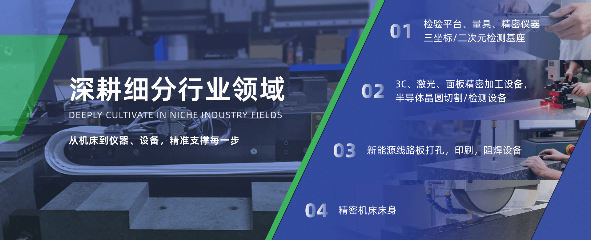 產品廣泛應用于3C、激光、半導體、醫(yī)療、新能源、檢測設備、直驅運動平臺、機床、非標自動化設備等領域。自成立以來,公司以“客戶價值為核心,卓越品質為基石,奮力鑄就中國第一”的企業(yè)高度,依托先進設備、一流技術與高素質團隊,在石材加工與開發(fā)應用領域持續(xù)創(chuàng)新,以穩(wěn)定的產品質量贏得客戶廣泛信任與贊譽。